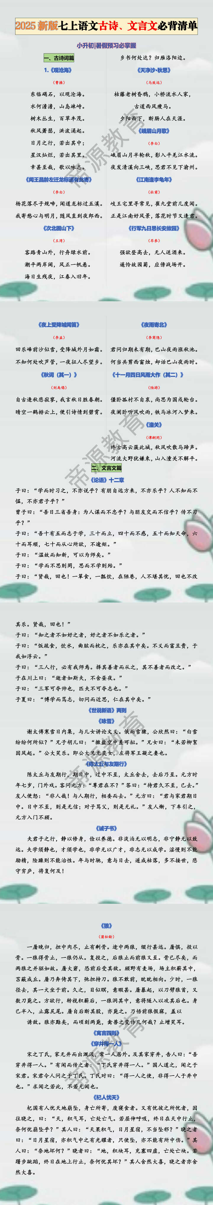 一、古诗词篇 1.《观沧海》 (曹操) 东临碣石,以观沧海。 水何澹澹,山岛竦峙。 树木丛生,百草丰茂。 秋风萧瑟,洪波涌起。 日月之行,若出其中; 星汉灿烂,若出其里。 幸甚至哉,歌以咏志。 《闻王昌龄左迁龙标遥有此寄》 (李白) 杨花落尽子规啼,闻道龙标过五溪。我寄愁心与明月,随风直到夜郎西。 《次北固山下》 (王湾) 客路青山外,行舟绿水前。 潮平两岸阔,风正一帆悬。 海日生残夜,江春入旧年。 乡书何处达?归雁洛阳边。