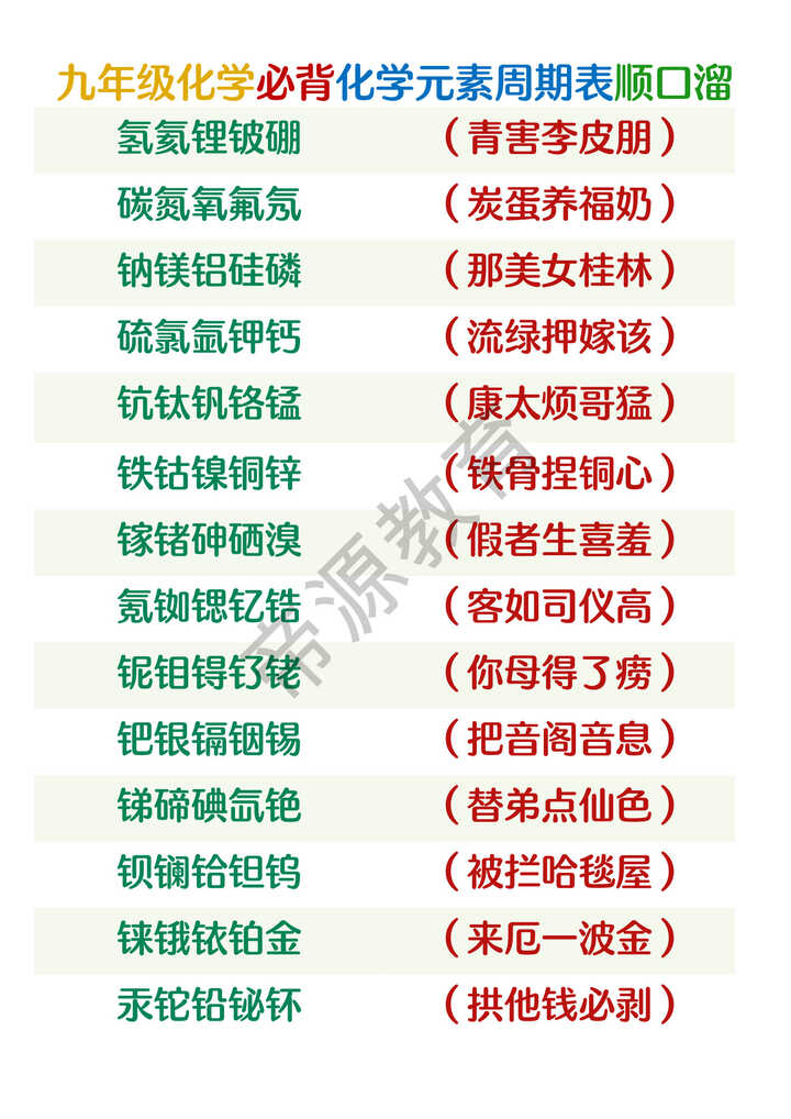 氢氦锂铍硼 (青害李皮朋) 碳氮氧氟氖 (炭蛋养福奶) 钠镁铝硅磷 (那美女桂林) 硫氯氩钾钙 (流绿押嫁该) 钪钛钒铬锰 (康太烦哥猛) 铁钴镍铜锌 (铁骨捏铜心) 镓锗砷硒溴 (假者生喜羞) 氪铷锶钇锆 (客如司仪高) 铌钼锝钌铑 (你母得了痨) 钯银镉铟锡 (把音阁音息) 锑碲碘氙铯 (替弟点仙色) 钡镧铪钽钨 (被拦哈毯屋) 铼锇铱铂金 (来厄一波金) 汞铊铅铋钚 (拱他钱必剥)