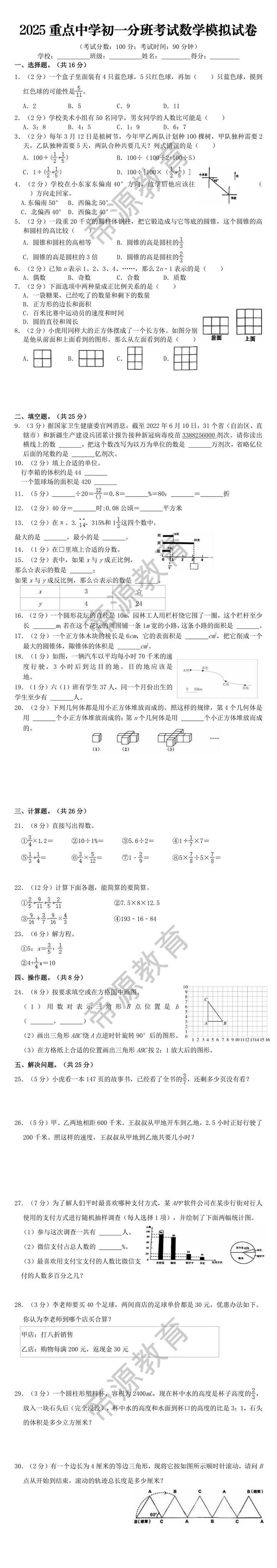 5.(2分)一段重20千克的圆柱体钢柱,把它锻造成与它等底的圆锥,这个圆锥的高和圆柱的高比较( )