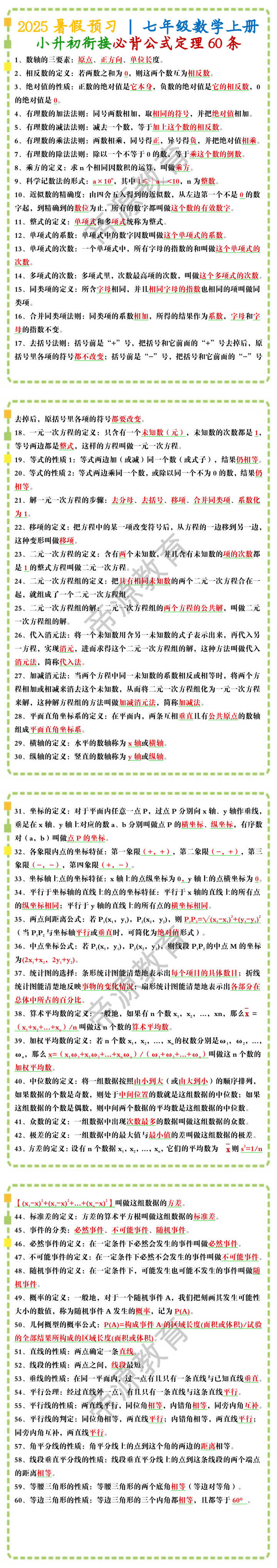 9、科学记数法的形式:a×10n,其中1≤∣a∣<10,n为整数。
