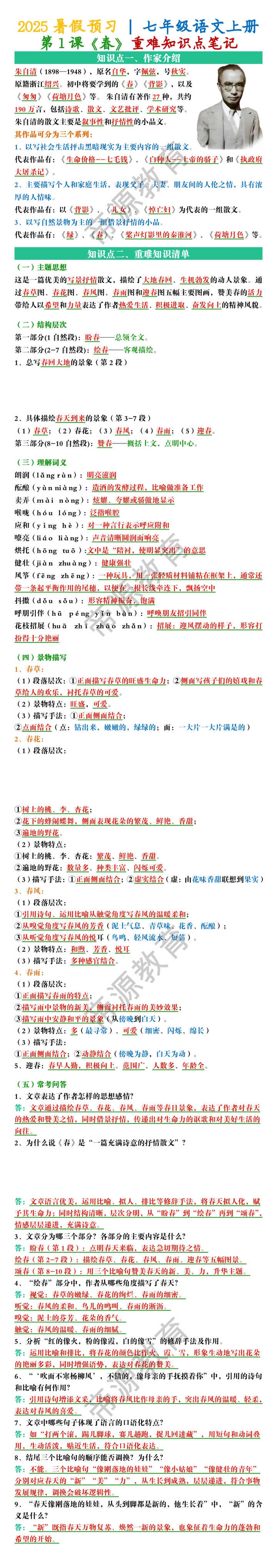 七年级语文上册第1课《春》重难知识点笔记