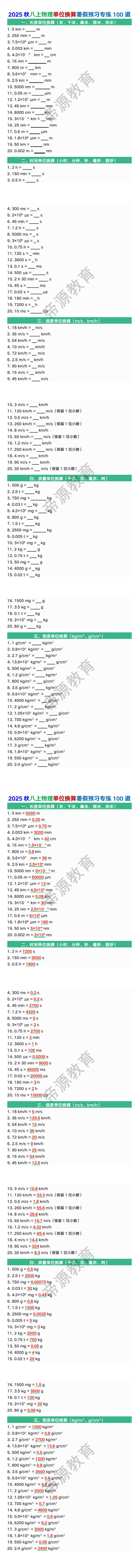 一、长度单位换算(米、千米、毫米、微米、纳米)