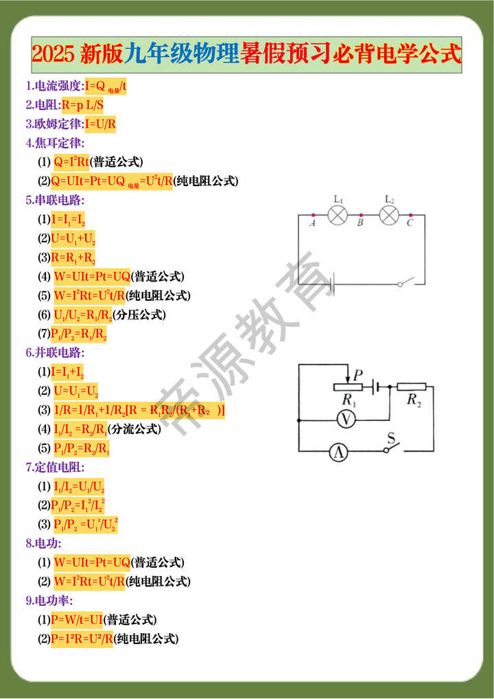 (2)Q=UIt=Pt=UQ电量=U2t/R(纯电阻公式)