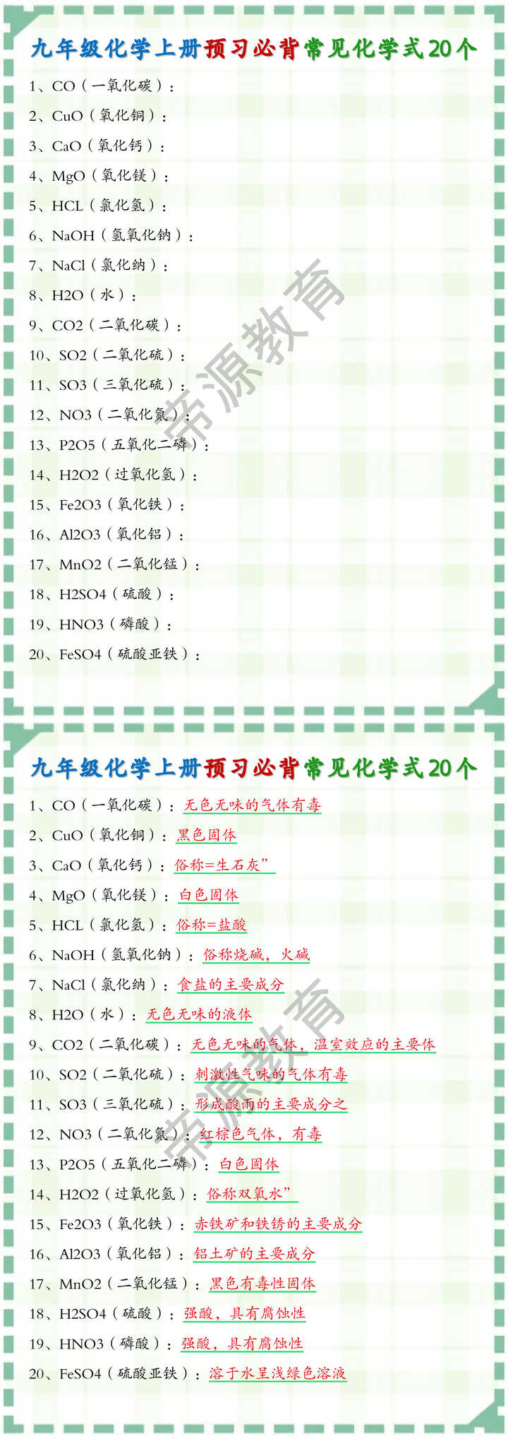 1、CO(一氧化碳):无色无味的气体有毒 2、CuO(氧化铜):黑色固体 3、CaO(氧化钙):俗称=生石灰” 4、MgO(氧化镁):白色固体 5、HCL(氯化氢):俗称=盐酸 6、NaOH(氢氧化钠):俗称烧碱,火碱 7、NaCl(氯化纳):食盐的主要成分 8、H2O(水):无色无味的液体 9、CO2(二氧化碳):无色无味的气体,温室效应的主要体 10、SO2(二氧化硫):刺激