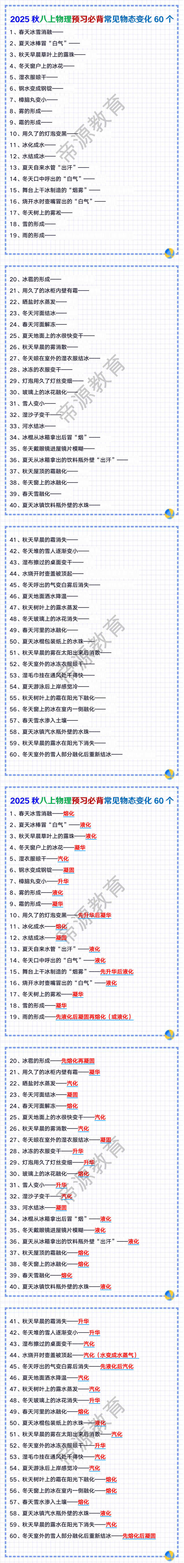 八年级物理上册必背常见物态变化60个
