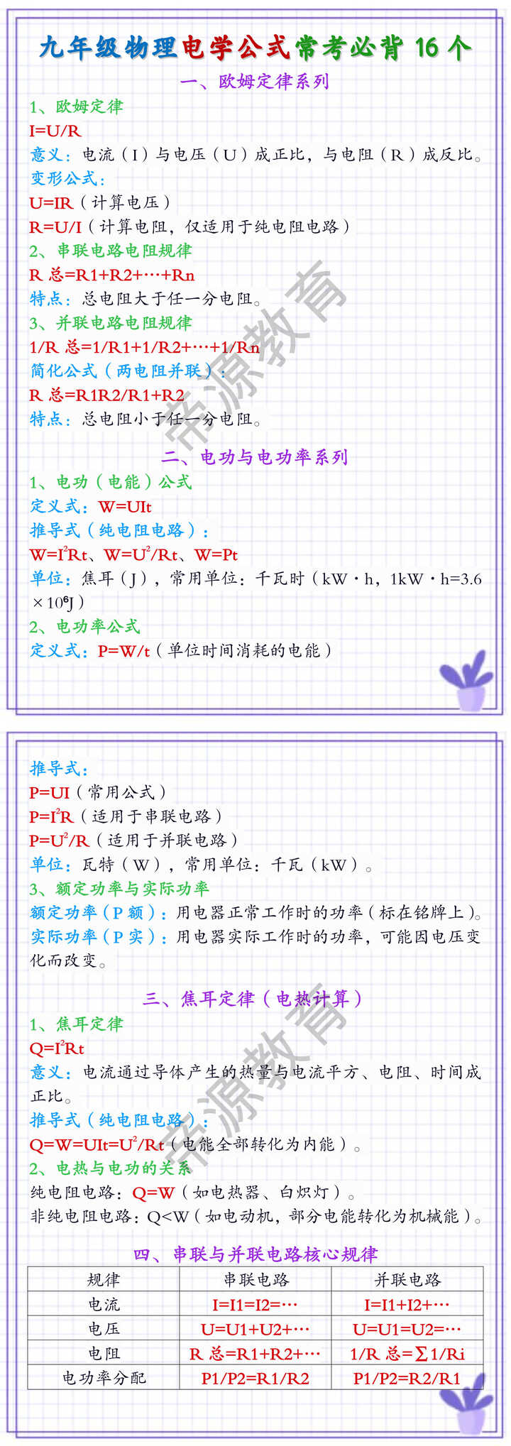 一、欧姆定律系列 1、欧姆定律 I=U/R 意义:电流(I)与电压(U)成正比,与电阻(R)成反比。 变形公式: U=IR(计算电压) R=U/I(计算电阻,仅适用于纯电阻电路) 2、串联电路电阻规律 R总=R1+R2+⋯+Rn 特点:总电阻大于任一分电阻。 3、并联电路电阻规律 1/R总=1/R1+1/R2+⋯+1/Rn 简化公式(两电阻并联): R总=R1R2/R1+R2 特点:总电阻小于任一分电阻。 二、电功与电功率系列 1、电功(电能)公式 定义式:W=UIt