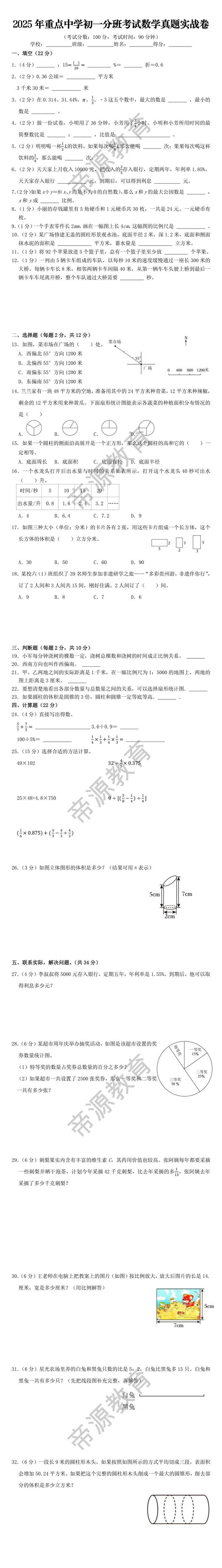 6.(2分)天天家上月收入10000元,把收入的存入银行,定期两年,年利率1.85%。天天家存入银行 元,到期后,可以得到利息 元。
