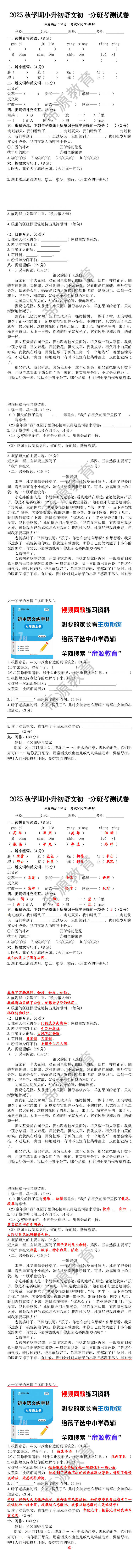 2025秋学期小升初语文初一分班考测试卷