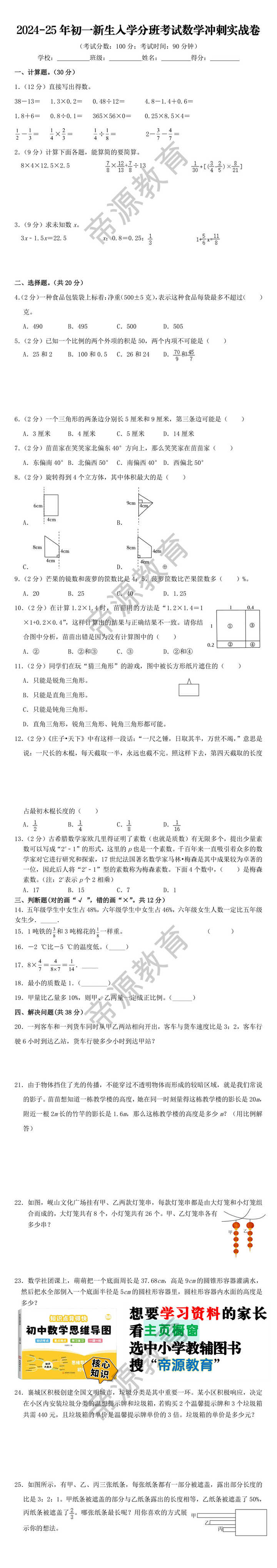 2024-25年初一新生入学分班考试数学冲刺实战卷
