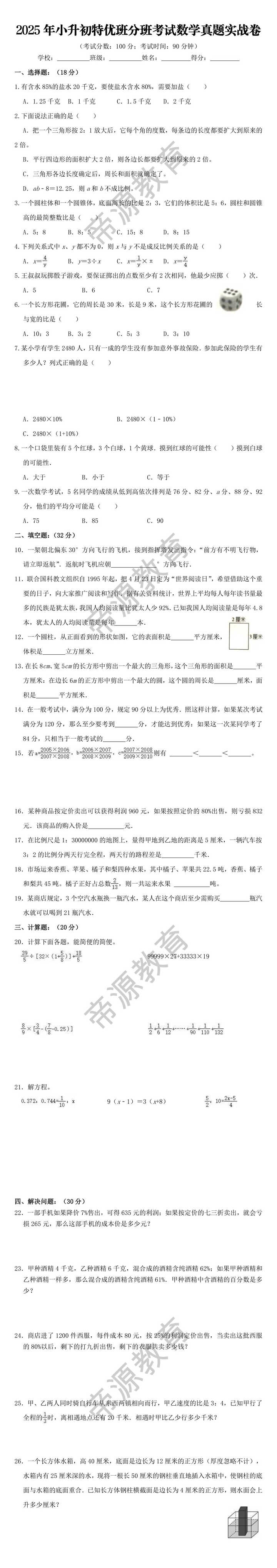 1.有含水85%的盐水20千克,要使盐水含水80%,需要加盐( )