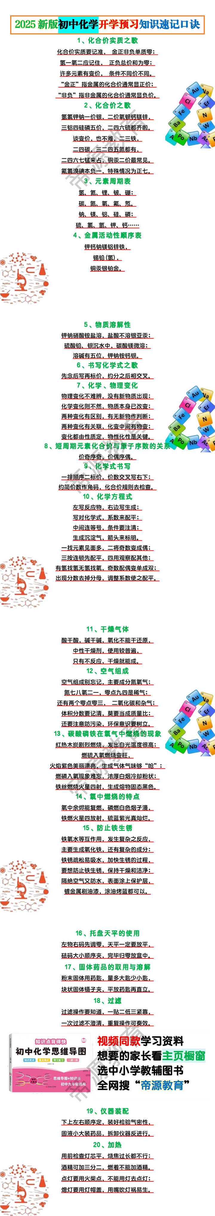 1、化合价实质之歌 化合价实质要记准, 金正非负单质零; 氢一氧二应记住, 正负总价和为零; 许多元素有变价, 条件不同价不同。 “金正”指金属的化合价通常显正价; “非负”指非金属的化合价通常显负价。 2、化合价之歌 氢氯钾钠一价银,二价氧钡钙镁锌, 三铝四硅磷五价,二四六硫都齐啦。 谈变价,也不难,二三铁, 二四碳,三二四五氮都有, 二四六七锰来占,铜汞二价最常见。 氟氯溴碘本负一,特殊情况为正七。