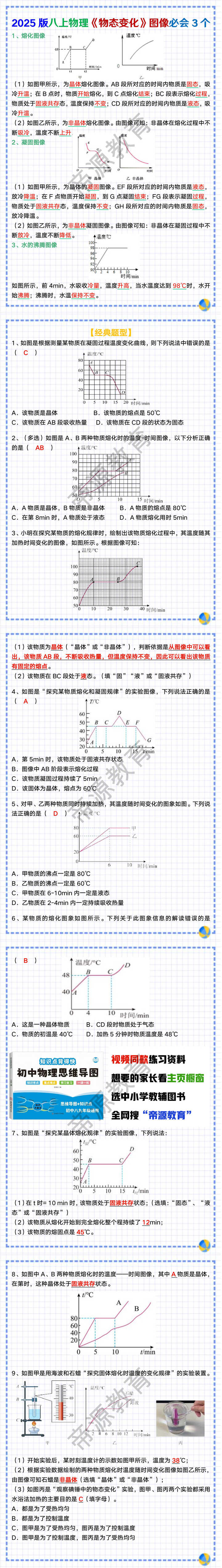 (1)如图甲所示,为晶体熔化图像。AB段所对应的时间内物质是固态,吸冷升温;在B点时,物质开始熔化,到C点熔化结束;BC段表示熔化过程,物质处于固液共存态,温度保持不变;CD段所对应的时间内物质是液态,吸冷升温。