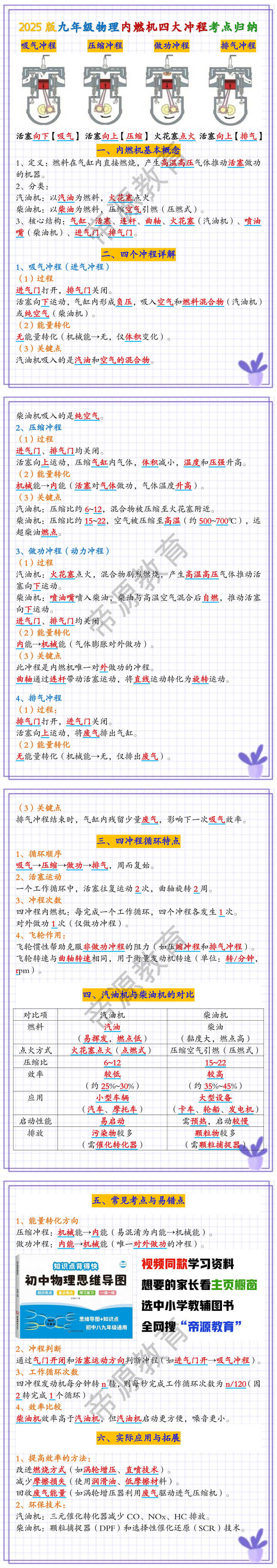 3、核心结构:气缸、活塞、连杆、曲轴、火花塞(汽油机)、喷油嘴(柴油机)、进气门、排气门。