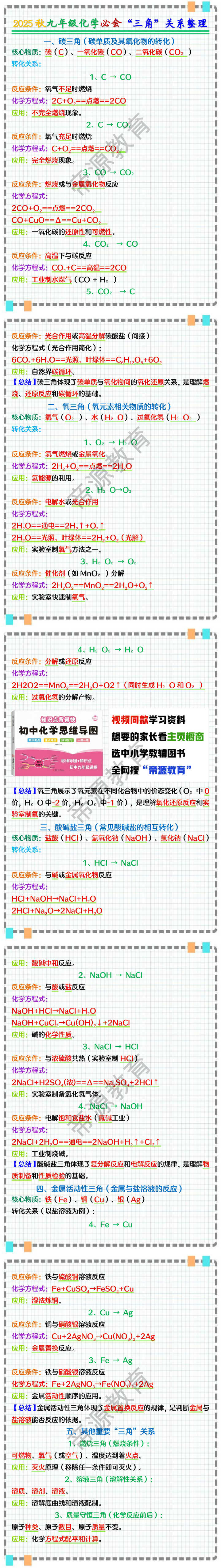一、碳三角(碳单质及其氧化物的转化) 核心物质:碳(C)、一氧化碳(CO)、二氧化碳(CO₂) 转化关系: 1、C → CO 反应条件:氧气不足时燃烧 化学方程式:2C+O2==点燃==2CO 应用:不完全燃烧现象。 2、C → CO₂ 反应条件:氧气充足时燃烧 化学方程式:C+O2==点燃==CO2 应用:完全燃烧现象。 3、CO → CO₂ 反应条件:燃烧或与金属氧化物反应 化学方程式: