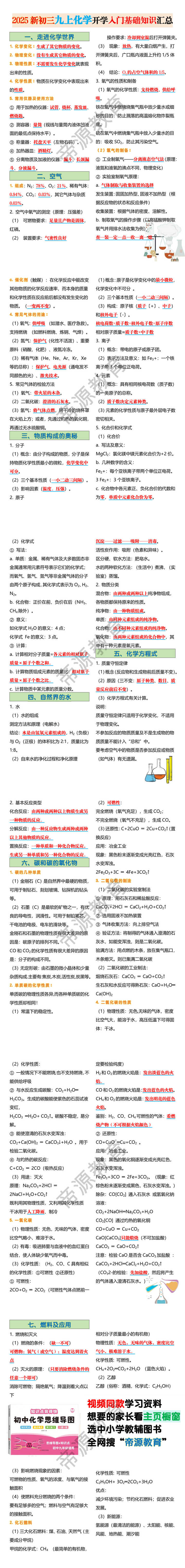 2025新初三九上化学开学入门基础知识汇总