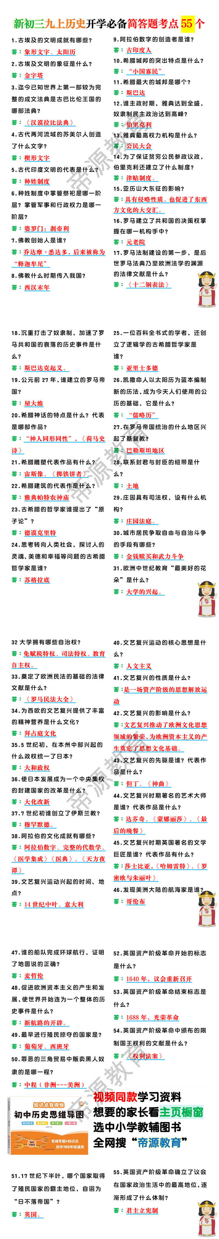 1.古埃及的文明成就有哪些? 答:象形文字、太阳历 2.古埃及文明的象征是什么? 答:金字塔 3.迄今已知世界上第一部较为完整的成文法典是古巴比伦王国的哪部法典? 答:《汉谟拉比法典》 4.古代两河流域的苏美尔人创造了什么文字? 答:楔形文字 5.古代印度文明的代表是什么? 答:种姓制度 6.种姓制度中掌管祭祀是哪一阶层?掌管军事和行政权力是哪一阶层? 答:婆罗门;刹帝利 7.佛教创始人是谁? 答:乔达摩·悉达多,后来被称为“释迦牟尼”