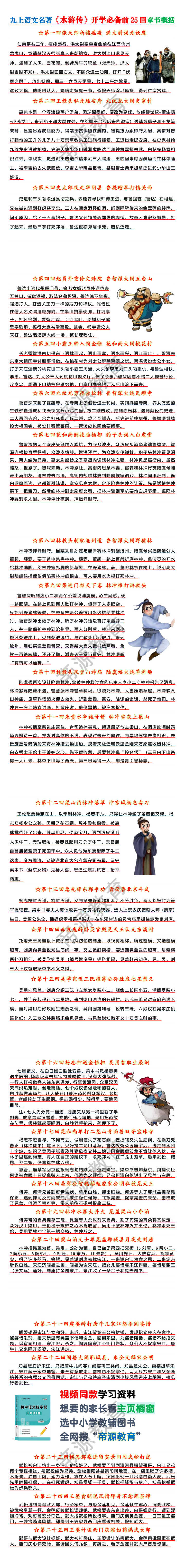 ☆第一回张天师祈禳瘟疫 洪太尉误走妖魔 仁宗嘉右三年,瘟疫盛行,洪太尉奉皇帝命前往江西信州龙虎山,宣请嗣汉天师张真人来朝禳疫。洪太尉上山求见天师,遇到了大虫、雪花蛇、倒骑黄牛的牧童(张天师,洪太尉当时不知)。洪太尉回至方丈,不顾众道士劝阻,打开“伏魔之殿”,放出妖魔,即三十六员天罡星,七十二座地煞星,遂致大祸。他吩咐从人,隐瞒走妖魔一节,假报天师除尽瘟疫,得到仁宗赏赐。 ☆第二回王教头私走延安府 九纹龙大闹史家村 高毬本是一个浮浪破落户子弟,因球踢得好,便改为高俅。他经柳世权-董生药-小苏学士,来到小王都太尉住处。在给端王(即后来的徽宗)送镇纸狮子和玉龙笔架时,显露出踢皮毬能力,得端王赏识留在府内,被提拔为殿帅府太尉。高俅对曾打翻他的王升的儿子八十万禁军教头王进施行报复。王进出走延安府,在史家村给九纹龙史进教枪棒。史进因擒少华山跳涧虎陈达而和神机军师朱武、白花蛇杨春相识往来。中秋夜,史进派王四送书请朱武三人喝酒,王四回来时因醉酒而在林中睡去,被李吉偷去朱武回信,李吉去华阴县报官,县尉带士兵来捉拿史进和少华山三好汉。 ☆第三回史太郎夜走华阴县 鲁提辖拳打镇关西 史进和三头领杀退县衙之兵,去延安寻找师傅王进,与鲁提辖(鲁达)在相遇,又在街边遇到打虎将李忠。三人在潘家酒楼吃酒,听到隔壁传来的金翠莲的哭声,问明原因,给了十五两银子。鲁达又到镇关西郑屠的肉铺,故意刁难激怒郑屠,打了起来,最后三拳打死郑屠,鲁达谎称郑屠诈死,趁机逃走。