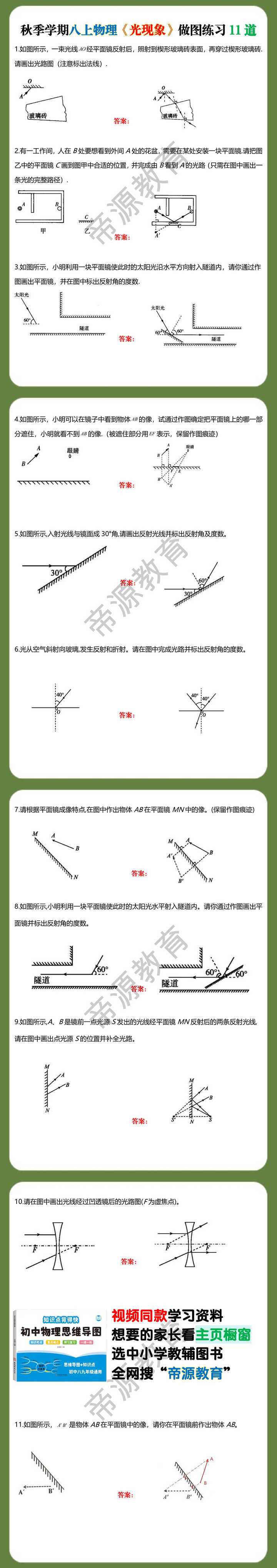 1.如图所示,一束光线经平面镜反射后,照射到楔形玻璃砖表面,再穿过楔形玻璃砖.请画出光路图(注意标出法线). 答案: 2.有一工作间,人在B处要想看到外间A处的花盆,需要在某处安装一块平面镜.请把图乙中的平面镜C画到图甲中合适的位置,并完成由B看到A的光路(只需在图中画出一条光的完整路径). 答案: 3.如图所示,小明利用一块平面镜使此时的太阳光沿水平方向射入隧道内,请你通过作图画出平面镜,并在图中标出反射角的度数