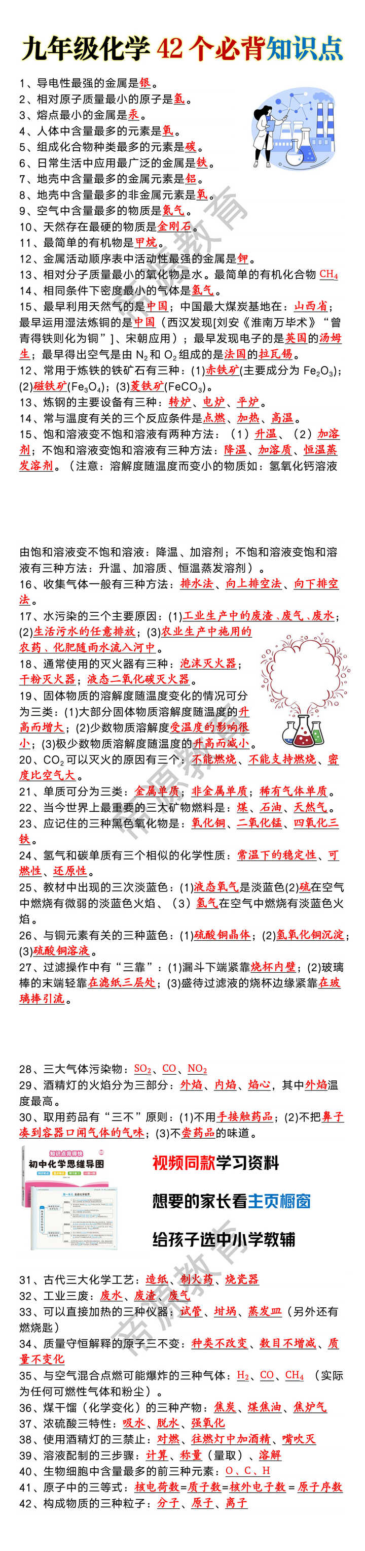 九年级化学42个必背知识点 1、导电性最强的金属是银。 2、相对原子质量最小的原子是氢。 3、熔点最小的金属是汞。 4、人体中含量最多的元素是氧。 5、组成化合物种类最多的元素是碳。 6、日常生活中应用最广泛的金属是铁。 7、地壳中含量最多的金属元素是铝。 8、地壳中含量最多的非金属元素是氧。 9、空气中含量最多的物质是氮气。 10、天然存在最硬的物质是金刚石。 11、最简单的有机物是甲烷。 12、金属活动顺序表中活动性最强的金属是钾