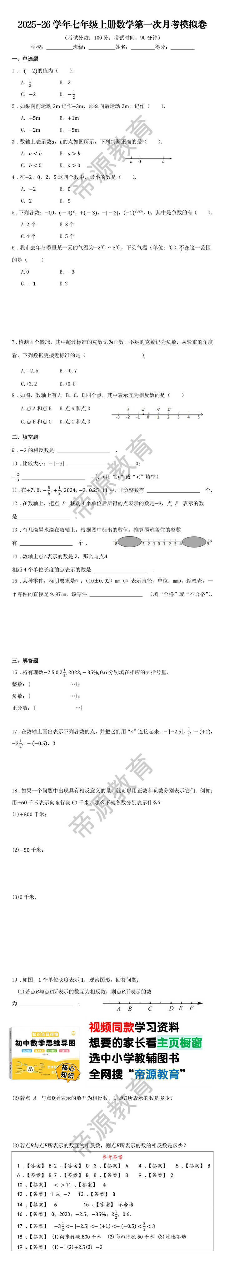 一、单选题 1 .的值为( ). A. B. C. D. 2 .如果向前运动记作,那么向后运动,记作( ). A. B. C. D. 3 .数轴上表示数,的点如图所示,下列判断正确的是( ). A. B. C. D. 4 .在,,,这四个数中,最小的数是( ). A. B. C. D. 5 .下列各数:,,,,,,其中是负数的有( ). A.个 B.个 C.个 D.个