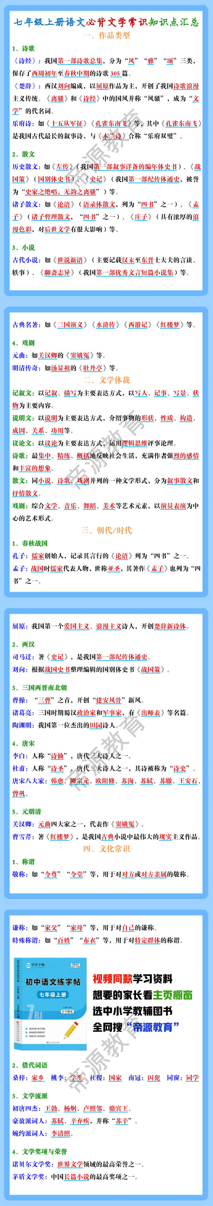 《楚辞》:西汉刘向编成,以屈原作品为主,开创了我国诗歌浪漫主义传统。《离骚》和《诗经》中的国风并称“风骚”,成为“文学”的代名词。