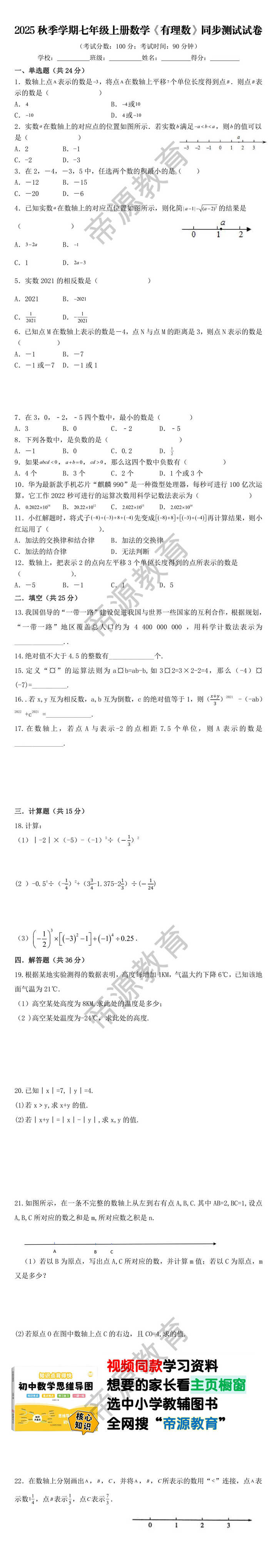 2025秋季学期七年级上册数学《有理数》同步测试试卷