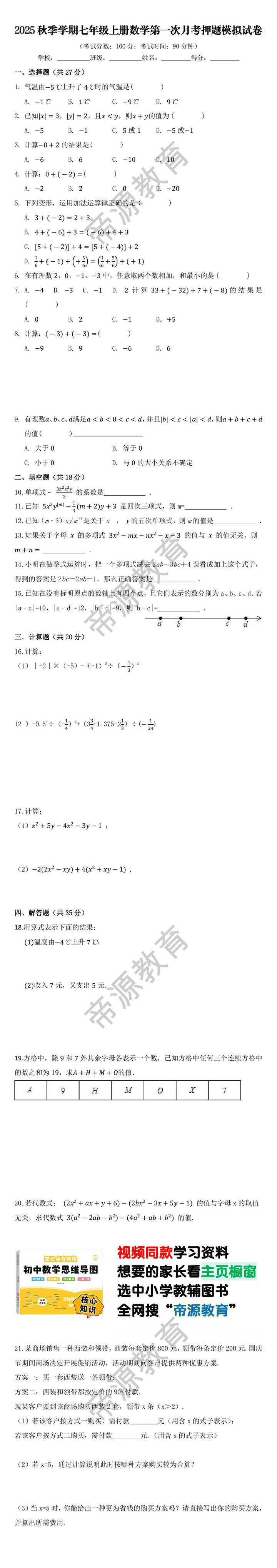 一、选择题(共27分) 1.气温由上升了时的气温是( ) A. B. C. D. 2.已知,,且,则的值为( ) A. B. C. 或 D. 或 3.计算的结果是( ) A. B. C. D. 4.计算:( ) A. B. C. D. 5.下列变形,运用加法运算律正确的是( ) A. B. C. D.