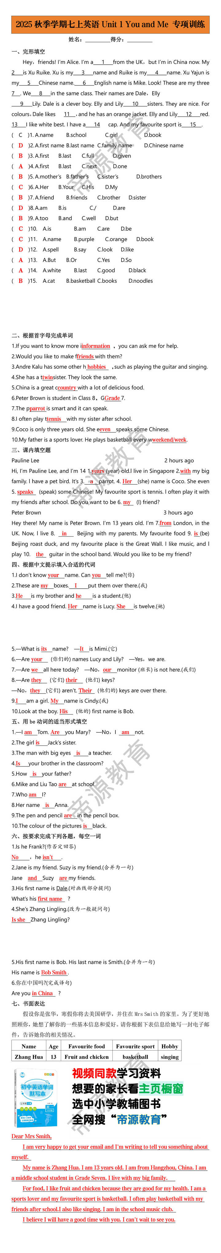 Hey,friends! I’m Alice. I’m a 1 from the UK,but I’m in China now. My 2 is Xu Ruike. Xu is my 3 name and Ruike is my 4 name. Xu Yajun is my 5 Chinese name. 6 English name is Mike. Look! These are my three 7 . We 8 in the same class. Their names are Dale,Elly