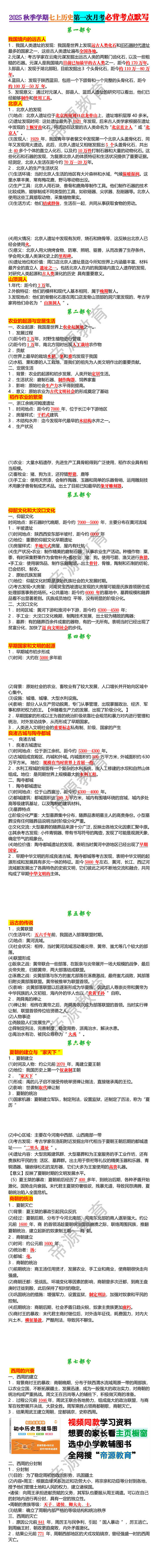 2025秋季学期七上历史第一次月考必背考点默写