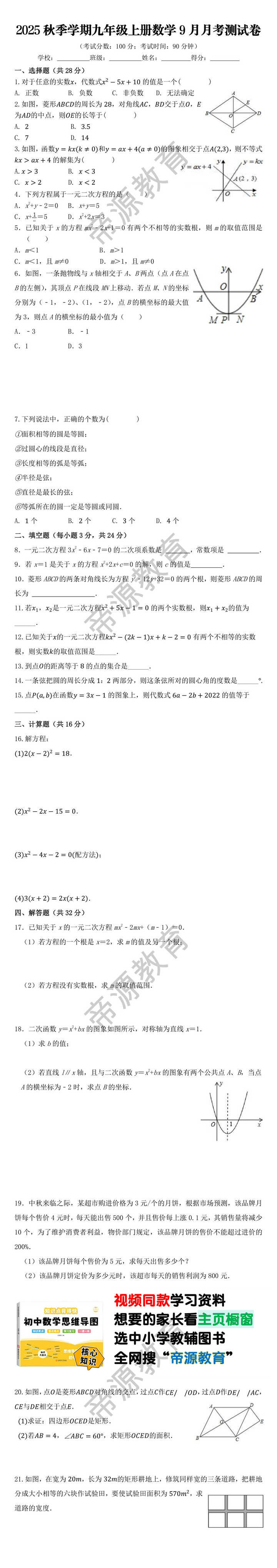 2025秋季学期九年级上册数学9月月考测试卷
