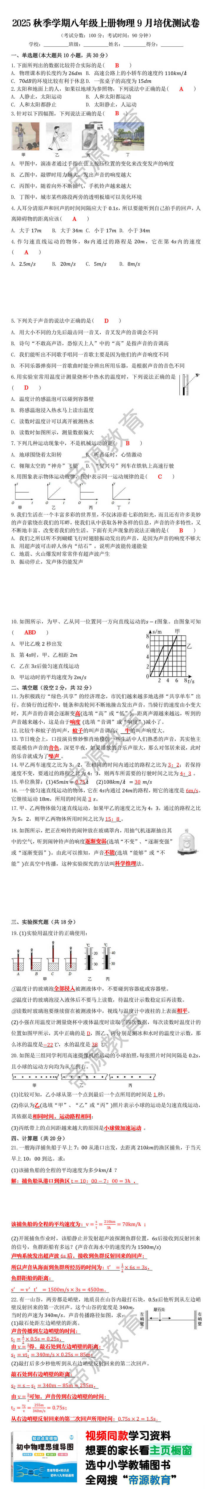 4.人耳分清原声和回声的时间间隔应大于,所以要能听到自己拍手的回声,人离障碍物的距离应该( A )