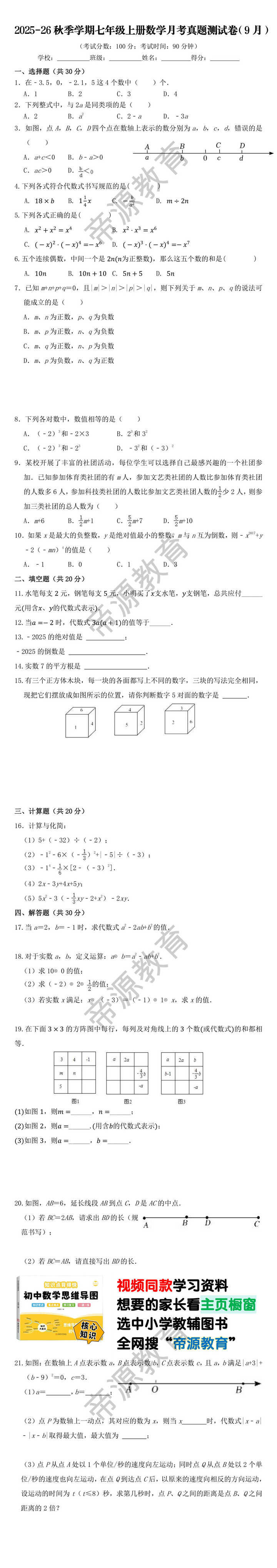 2025-26秋季学期七年级上册数学月考真题测试卷(9月)