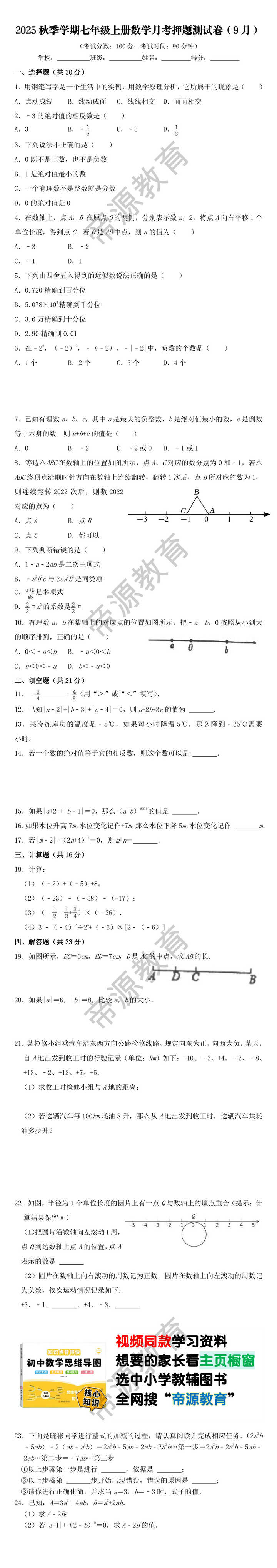 2025秋季学期七年级上册数学月考押题测试卷(9月)