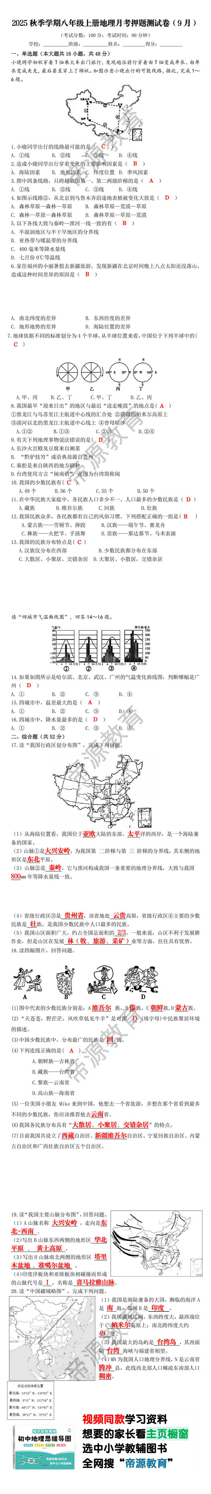 2025秋季学期八年级上册地理月考押题测试卷(9月)