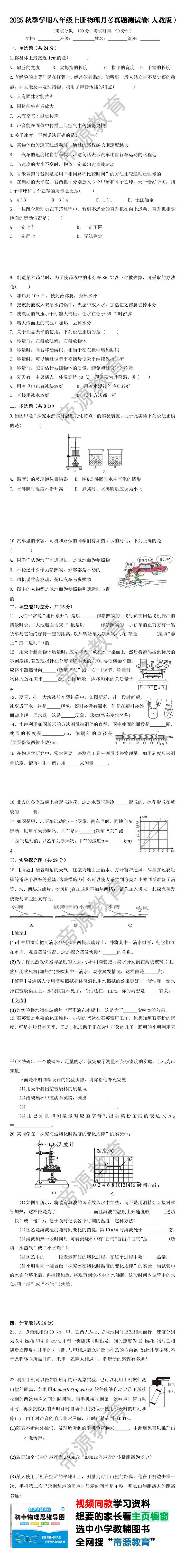 2025秋季学期八年级上册物理月考真题测试卷(人教版)