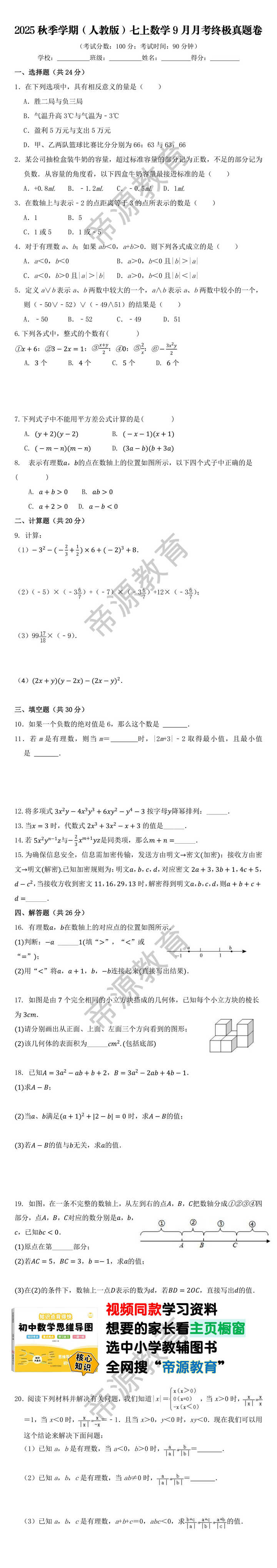 2025秋季学期(人教版)七上数学9月月考终极真题卷