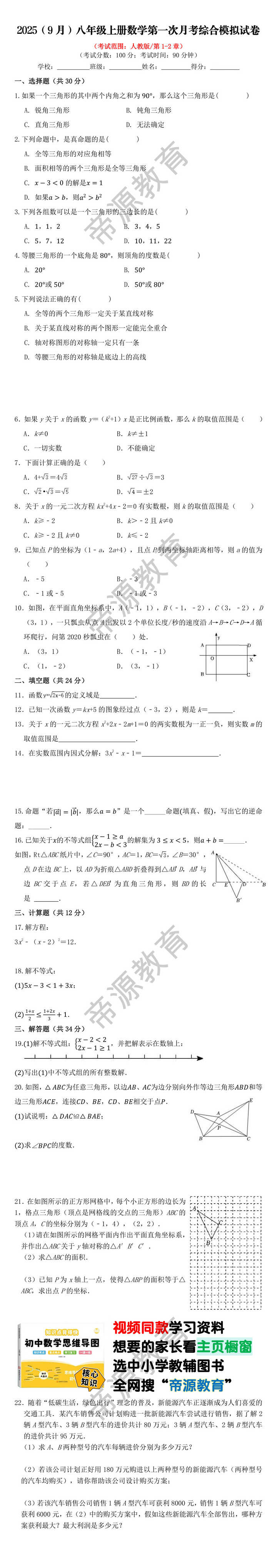 2025(9月)八年级上册数学第一次月考综合模拟试卷