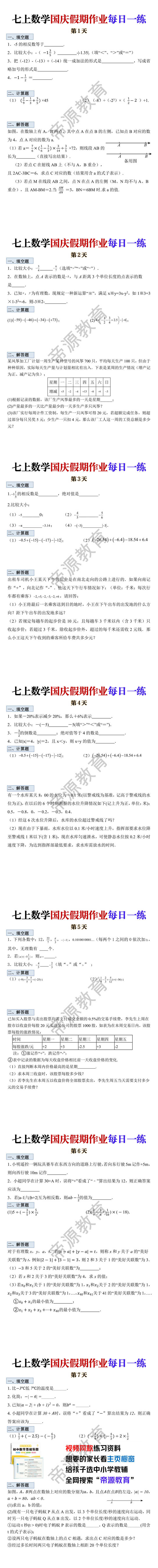 七上数学国庆假期作业每日一练