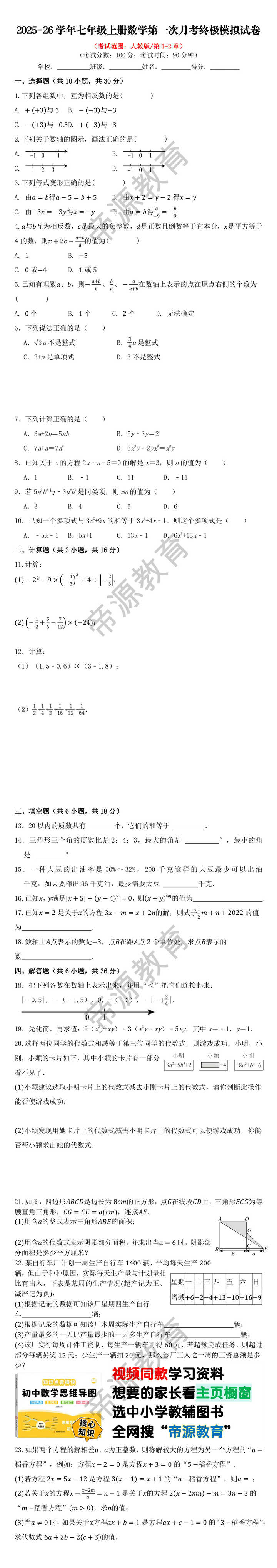 2025-26学年七年级上册数学第一次月考终极模拟试卷