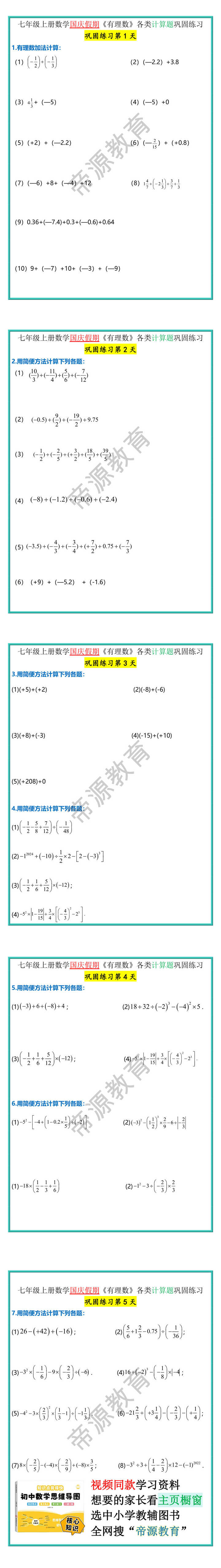 七年级上册数学国庆假期《有理数》各类计算题巩固练习