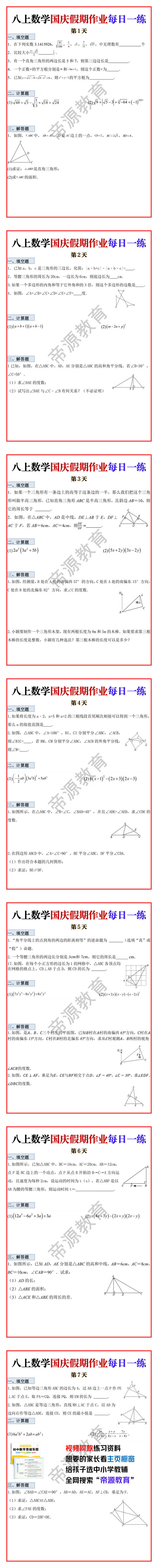 八上数学国庆假期作业每日一练 第1天 一、填空题 1.在下列实数3.1415926,,,,,,中无理数有 个 2.比较大小 . 3.有一个直角三角形的两边长是5和7,则第三边边长是 . 4.一个正数的平方根分别是和,则这个正数为 . 5.已知,则的平方根为 . 二、计算题 (1) (2) 三、解答题 1.如图,中,,D是边上的一点,,,. (1)求证:是直角三角形